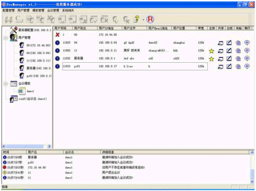 簡單方便的用戶管理,可以增加用戶、修改用戶信息、刪除用戶等。在會議中可以實時地檢測和顯示用戶的網(wǎng)絡(luò)狀態(tài)。