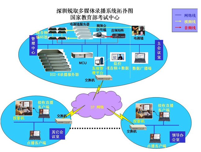 國家教育部考試中心為了對高考等大型考試實(shí)時性指導(dǎo)、監(jiān)考、培訓(xùn)等,特建立了視頻會議系統(tǒng)、監(jiān)考系統(tǒng)。為了使整個系統(tǒng)更完善、應(yīng)用價值更高,因此在此基礎(chǔ)上配置了銳取多媒體錄播系統(tǒng)。不僅實(shí)現(xiàn)了與各地考試中心及考點(diǎn)的圖像、語音和數(shù)據(jù)的交互通訊,還可以輔助系統(tǒng)完成視頻會議、監(jiān)考系統(tǒng)及培訓(xùn)的錄制、直播和點(diǎn)播功能,錄制、直播和點(diǎn)播的內(nèi)容包括了所有考試中心、考點(diǎn)圖像以及聲音和數(shù)據(jù)信號。