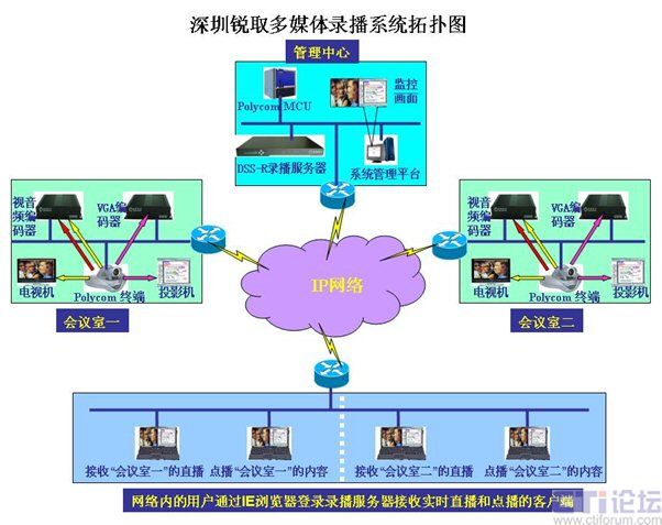 錄播服務(wù)器放置在管理中心,視音頻編碼器(采集聲音、圖像)放置在會(huì)議室,VGA編碼器(采集VGA信號(hào))放置在會(huì)議室,客戶端分別為網(wǎng)絡(luò)內(nèi)的任意一臺(tái)計(jì)算機(jī)。整個(gè)系統(tǒng)簡單明了,分布靈活,無需專業(yè)布線即可完成安裝。各部分功能如下: