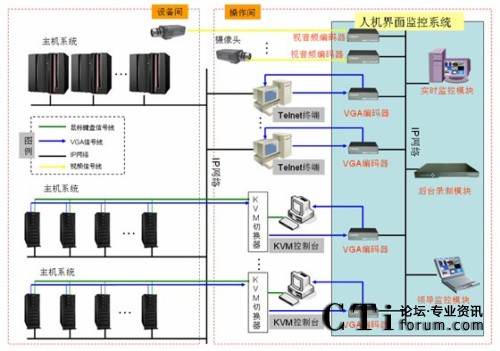 如上圖所示,該機(jī)房分為設(shè)備間和操作間,小型機(jī)等主機(jī)系統(tǒng)安裝在設(shè)備間內(nèi),平時(shí)工作人員通常在操作間內(nèi)通過Telnet終端及KVM控制臺等方式訪問主機(jī)系統(tǒng)進(jìn)行操作,這些Telnet終端、KVM控制臺即為機(jī)房內(nèi)人與機(jī)器打交道的“人機(jī)界面”。