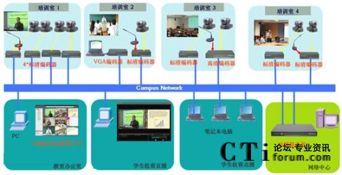 在南洋理工的商學院中有一個培訓中心,培訓中心中有4個培訓課室。 商學院的老師們希望可以把這4培訓課室中的培訓課程錄制下來,并可以同時直播到其它教室。老師可以監(jiān)控這4個培訓課室的培訓情況。學生可以使用PC通過校園網(wǎng)收看到實時的培訓情況,及培訓后的回放他們可能錯過了的培訓。系統(tǒng)可與NTU現(xiàn)有的E_learning系統(tǒng)無縫融合,為為豐富E_learning的課件資源提供低成本、高效率的制作手段。同時系統(tǒng)應該便于維護及用戶界面友好,而且便于以后的擴容。因培訓室的功能差異,每一間培訓室內(nèi)所需記錄的信號類型及數(shù)量均不相同,要求系統(tǒng)能夠進行匹配和適應。