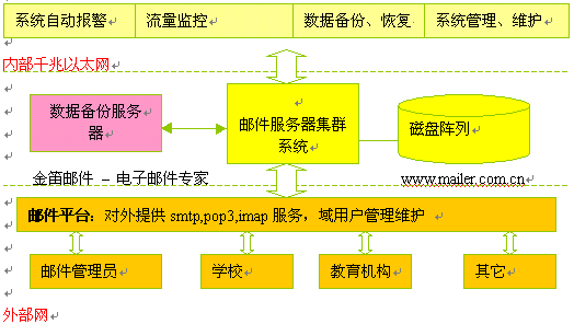本方案是根據(jù)沈陽教育信息中心對電子郵件系統(tǒng)大容量、高擴(kuò)展性、分級管理的實際要求,結(jié)合金笛郵件集群系統(tǒng)的技術(shù)特點,本著高速穩(wěn)定、易于管理、易于維護(hù)、適度超前的原則,可以作為實施方案的參考。
