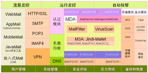 1. 郵件集群系統(tǒng)由二個smtp server、一個pop3/imap server、一個認(rèn)證服務(wù)器ldap、和磁盤陣列組成。監(jiān)控中心由流量監(jiān)控、運行監(jiān)控、SMS報警、系統(tǒng)管理、查詢運維終端組成。