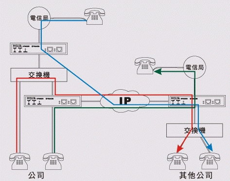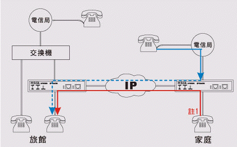 在旅館里亦可利用公司FONEMOSA遠(yuǎn)易通撥出電話及收聽(tīng)語(yǔ)音信箱 將FONEMOSA遠(yuǎn)易通在旅館房間裝設(shè)好后,可以在旅館里免費(fèi)使用各地分公司交換機(jī)所有功能,撥接電話就像在辦公室一樣,也可以撥接其它同仁分機(jī)電話,或者聽(tīng)取語(yǔ)音留言,舉凡各類(lèi)公司交換機(jī)功能,在旅館里都一樣可以使用。(圖標(biāo): On-Net Call 網(wǎng)內(nèi)互打, 紅色線路)