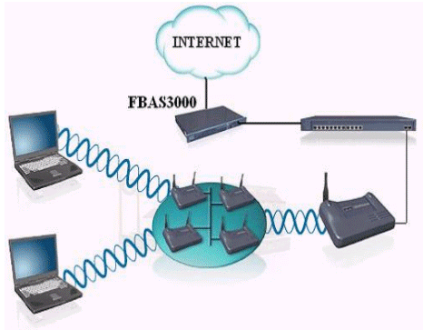 移動用戶通過自身的無線網(wǎng)卡傳遞信息到熱點接收器上,熱點接收器連接到交換機(是為了能具有更好的可拓展性),交換機連接到華夏科技FutureWorks寬帶計費系統(tǒng)的FBAS接入服務(wù)器上,通過接入服務(wù)器連接到INTERNET.這里的FBAS3000系列的寬帶接入服務(wù)器采用的是一體機的模式,接入,認證,計費等一系列服務(wù)均安裝在FBAS里,這樣可以簡化網(wǎng)絡(luò)結(jié)構(gòu)。對FBAS的操作是通過WEB頁面來進行設(shè)置維護的,
