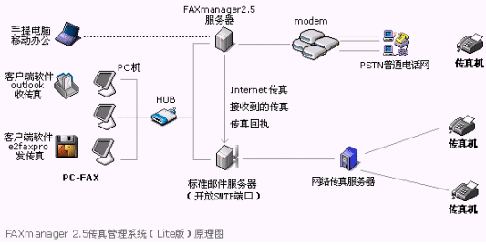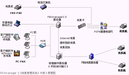 FAXmanager 2.5傳真管理系統(tǒng)安裝在局域網的一臺專用服務器上,運行環(huán)境可以是:Windows98/NT/2000/XP等,此服務器可以同郵件服務器為同一臺機器,構成企業(yè)郵件/傳真專用服務器,FAXmanager 2.5可以和企業(yè)郵件系統(tǒng)或群件系統(tǒng)整合使用,可以是Unix/Linux環(huán)境的Qmail和Sendmail等郵件系統(tǒng),也可以是Microsoft Exchange和Lotus Domino/Notes等群件系統(tǒng),當然也可以是IComMail等企業(yè)郵件系統(tǒng),也支持虛擬主機設置企業(yè)郵局開設POP3帳戶和上網代理服務器的使用環(huán)境。