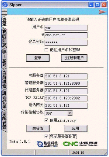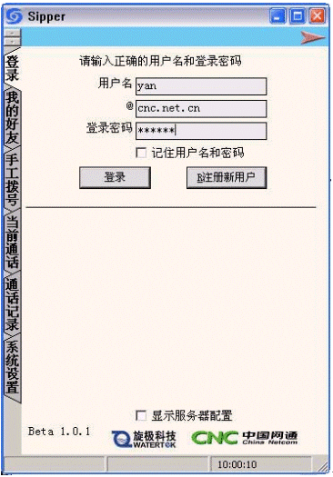 在主界面上選擇"注冊(cè)新用戶",這時(shí)會(huì)出現(xiàn)網(wǎng)通的注冊(cè)界面,選擇"開(kāi)始注冊(cè)",然后將各項(xiàng)用戶信息填寫清楚后,創(chuàng)建用戶,成功后即可回到sipper界面登陸。