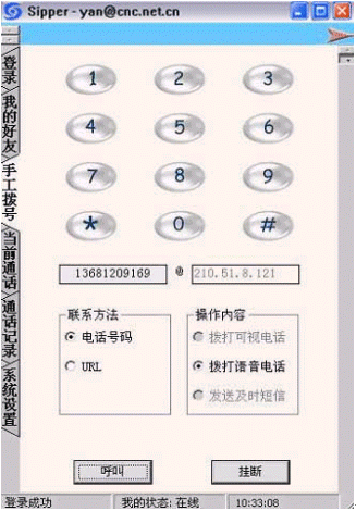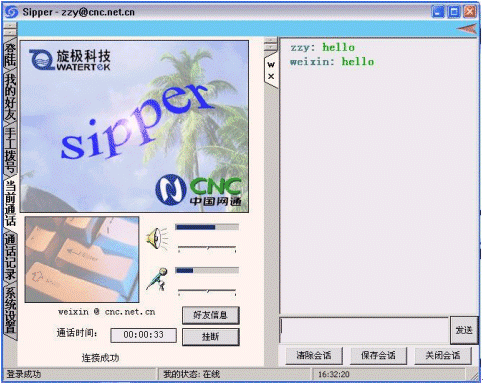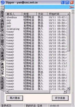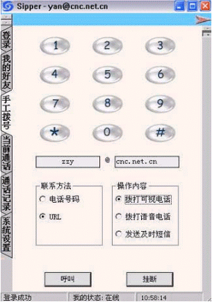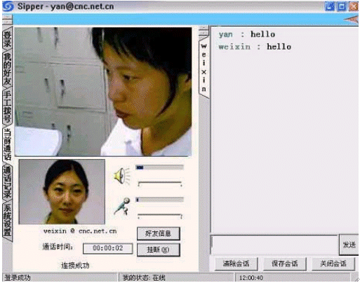 點(diǎn)擊后會(huì)出現(xiàn)對(duì)話窗口,同時(shí)在對(duì)方的機(jī)器上會(huì)出現(xiàn)你的呼叫請(qǐng)求,如果對(duì)方"接收"了你的請(qǐng)求,則兩個(gè)人的語(yǔ)音對(duì)話開(kāi)始,雙方可以互相聽(tīng)到聲音,沒(méi)有圖象,可以同時(shí)進(jìn)行短信交流。