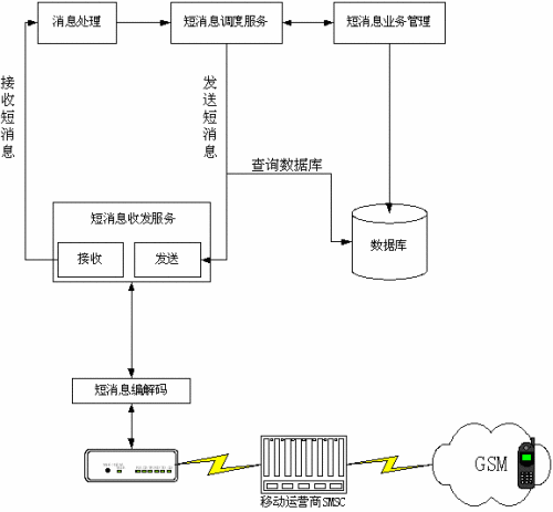 用戶確定發(fā)送后經(jīng)過發(fā)送函數(shù)調(diào)用底層的設備DLL,通過GSM-MODEM發(fā)送至運營商的短消息服務中心(SMSC),再轉發(fā)至接收地址的手機上,從而完成發(fā)送流程。