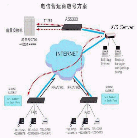電信運營商放號方案采用寬帶數據網絡接入到運營商,IP電話數據流通過寬帶數據網絡接入運營商的局端網關設備,或者直接進入IP電話網絡。與傳統(tǒng)的電話相比,電信運營商放號方案不需要太多的額外投資購買硬件設備;只需在用戶端安裝NETONE語音網關或IP電話機,話吧、網吧、企業(yè)網用戶、校園網用戶及個人用戶就可以在現有的網絡基礎上實現IP電話放號服務。