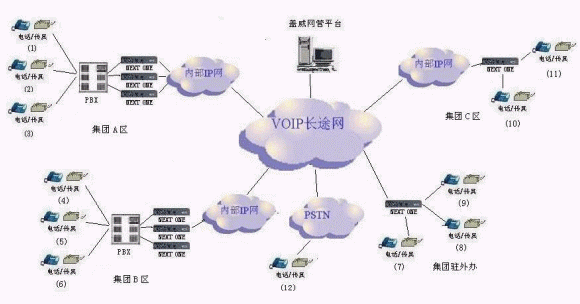 深圳市蓋威科技有限公司完整的語(yǔ)音解決方案如下,用一個(gè)網(wǎng)管平臺(tái)(AVS SERVER)來(lái)管理眾多企業(yè),各企業(yè)分支機(jī)構(gòu)間可以實(shí)現(xiàn)相互通話免話費(fèi),另外將企業(yè)內(nèi)部通話之外的電話通過(guò)網(wǎng)管平臺(tái)接入到電信營(yíng)運(yùn)商的VoIP