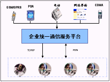 統(tǒng)一通信平臺提供了與企業(yè)內(nèi)部交換機(PBX)或PSTN,寬帶或INTERNET和GSM或GPRS網(wǎng)絡(luò)的接口,融合了多種網(wǎng)絡(luò)資源和企業(yè)內(nèi)部數(shù)據(jù)源。為用戶提供了多種服務(wù)界面:WEB界面、人工服務(wù)界面,IVR界面。同時為用戶提供短信息等數(shù)據(jù)業(yè)務(wù)。