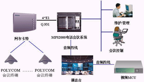 國電中心的音頻電話會議系統(tǒng)采用MPS2000電話會議系統(tǒng)。MPS2000電話會議系統(tǒng)通過4個E1與阿爾卡特的4400交換機相連,采用Pri信令,用戶通過POLYCOM的會議終端機參加會議;MPS2000電話會議系統(tǒng)通過音頻四線與調音臺相連,并通過調音臺與視頻MCU相連,同時MPS2000電話會議系統(tǒng)通過以太網(wǎng)與其內部的局域網(wǎng)相連,同時在局域網(wǎng)內設置一臺維護終端用于對系統(tǒng)的維護管理,會議控制臺通過WEB方式對會議進行控制。