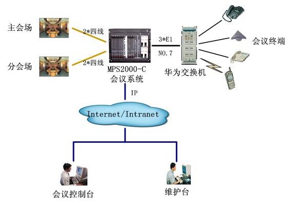 該會議系統(tǒng)通過3個數(shù)字中繼,與華為用戶交換機互連,通信采用NO.7信令。4路4線中2路接主會場調(diào)音臺,2路分會場調(diào)音臺,實現(xiàn)會議室擴音設(shè)備的接入。通過以太網(wǎng)口與D-LINK網(wǎng)絡(luò)交換機互連,接入廊坊電力的局域網(wǎng),實現(xiàn)維護管理及會議控制等功能。