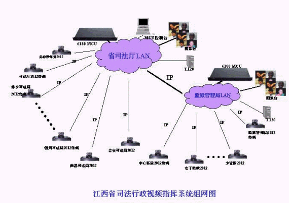 江西司法視頻會議系統(tǒng)的拓?fù)浣Y(jié)構(gòu)如圖所示。整個視頻會議系統(tǒng)為星型拓?fù)浣Y(jié)構(gòu),其中二級網(wǎng)以省司法廳和省監(jiān)獄管理局為主會場,放置2個MCU;另外,包括11個地市司法局的分會場(南昌、九江、贛州、吉安、撫州、鷹潭、萍鄉(xiāng)、新余、上饒、景德鎮(zhèn)、宜春),14個監(jiān)獄和農(nóng)場分會場,傳輸網(wǎng)絡(luò)為2M IP網(wǎng)絡(luò),視頻會議協(xié)議為H.323;司法局和監(jiān)獄管理局也可以單獨成網(wǎng),在分別依托省司法廳和省監(jiān)獄管理局MCU的情況下,各地市司法局或監(jiān)獄系統(tǒng)可與省司法廳或省監(jiān)獄管理局單獨進(jìn)行雙向的視頻會議,整個系統(tǒng)具有很強(qiáng)的靈活性和擴(kuò)展性。