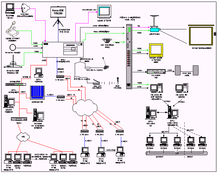 1、 電視會(huì)議系統(tǒng)包括一臺(tái)MCU和13臺(tái)iPower900,通過IP網(wǎng)絡(luò)和E1專線兩種線路連接。為了將視頻會(huì)議的功能進(jìn)行擴(kuò)展,我們?cè)黾恿硕喾N外圍設(shè)備,包括:實(shí)物投影儀、白板掃描儀、無線話筒、DV31攝像機(jī)等輸入設(shè)備,彩色電視機(jī)、三菱投影機(jī)和功放、音箱等輸出設(shè)備以及8×4視頻切換矩陣。