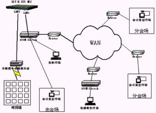 多點控制器采用鼎視通公司的DST H.323 MCS多點控制單元。DST H.323 MCS是鼎視通公司最新研制開發(fā)的高性能媒體交換設(shè)備,提供在分組交換網(wǎng)絡(luò)平臺之上的多種媒體交換服務(wù)。其面向的用戶既可以是企業(yè)、機關(guān)、學校等中小規(guī)模用戶,也可以是網(wǎng)絡(luò)運營商、業(yè)務(wù)提供商等大型用戶。并且它是唯一一款支持電視墻輸出的多點控制單元,同時結(jié)合鼎視通公司的多畫面電視墻服務(wù)器實現(xiàn)主會場電視墻的輸出。