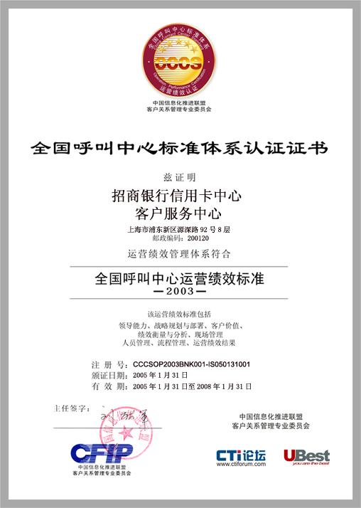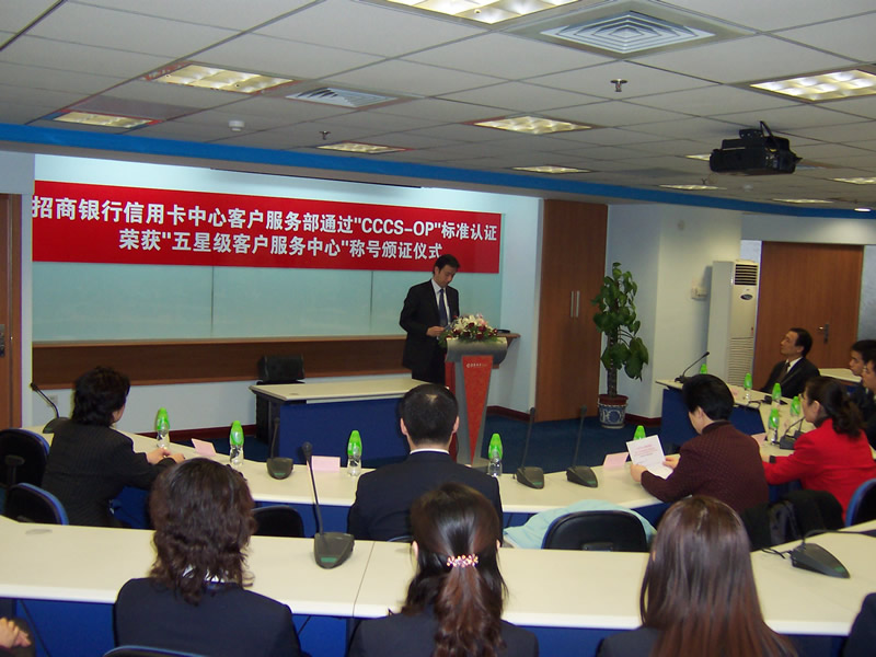 招商銀行信用卡中心客戶(hù)服務(wù)中心(800-820-5555)成立于2002年,是集電話(huà)服務(wù)熱線、傳真、電子郵件、短信服務(wù)以及互聯(lián)網(wǎng)等客戶(hù)溝通渠道于一體的多功能客戶(hù)服務(wù)中心,為所有招商銀行信用卡用戶(hù)提供365×24×7全年無(wú)休的優(yōu)質(zhì)客戶(hù)服務(wù),曾榮獲“2004中國(guó)最佳呼叫中心”稱(chēng)號(hào)。作為中國(guó)銀行業(yè)率先加入CCCS標(biāo)準(zhǔn)認(rèn)證體系的企業(yè),通過(guò)此次認(rèn)證,一方面使得招商銀行客戶(hù)服務(wù)中心的運(yùn)營(yíng)管理水平進(jìn)一步得到了提升和改善,實(shí)現(xiàn)規(guī)范化、精細(xì)化;另一方面,CCCS標(biāo)準(zhǔn)也從該公司在客戶(hù)服務(wù)和客戶(hù)關(guān)系管理方面所積累起來(lái)的寶貴實(shí)踐經(jīng)驗(yàn)中汲取了養(yǎng)分,使CCCS標(biāo)準(zhǔn)能夠不斷地完善和發(fā)展。