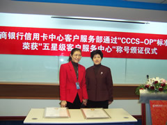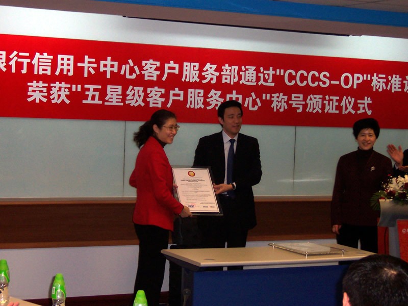 這天的上午10點(diǎn)30分,在招商銀行信用卡中心上?偛颗e行了簡(jiǎn)約而隆重的頒證儀式,信用卡中心常務(wù)副總經(jīng)理梁瑤蘭從信息產(chǎn)業(yè)部電子信息中心副主任、中國(guó)信息化推進(jìn)聯(lián)盟秘書(shū)長(zhǎng)劉獻(xiàn)軍手中接過(guò)證書(shū),標(biāo)志著國(guó)內(nèi)第一家五星級(jí)客戶(hù)服務(wù)中心誕生了!