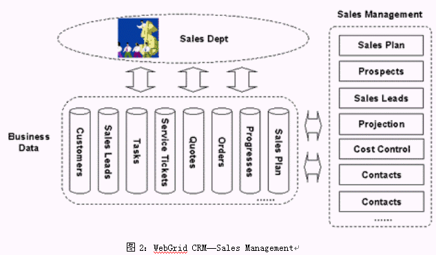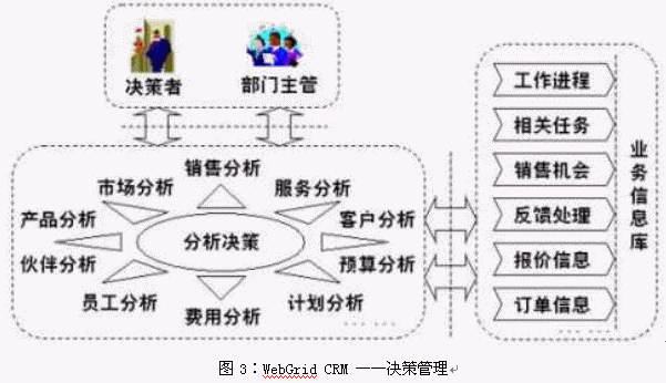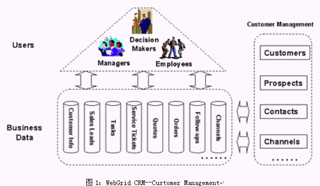 WebGrid CRM是基于CRM理念而設(shè)計(jì)的,它將面向客戶的所有業(yè)務(wù)進(jìn)行整合,提供了統(tǒng)一的業(yè)務(wù)平臺(tái),并使用工作流技術(shù)將各種業(yè)務(wù)緊密聯(lián)系起來。WebGrid CRM 的功能可以歸納為三個(gè)方面:1) 對(duì)銷售、營(yíng)銷和客戶服務(wù)三部分業(yè)務(wù)流程的信息化;2) 與客戶進(jìn)行溝通所需要的手段(如電話、傳真、網(wǎng)絡(luò)、Email等)的集成和自動(dòng)化處理;3) 對(duì)上面兩部分功能所積累下的信息進(jìn)行的加工處理,產(chǎn)生客戶智能,為企業(yè)的戰(zhàn)略戰(zhàn)術(shù)的決策作支持。見下圖所示: