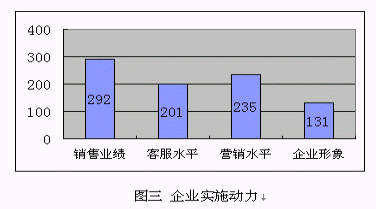 3) 提升企業(yè)形象:很多受訪企業(yè)特別是服務(wù)業(yè),已經(jīng)建立客戶忠誠(chéng)度放在了很重要的位置,但比較其它幾個(gè)直接動(dòng)因,比例偏低,這也說明"以客戶為中心"的觀念還沒有"以利潤(rùn)為中心"強(qiáng)烈。