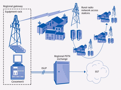 這里,每一本地-鄉(xiāng)村網(wǎng)絡里的"電話對"是通過Aculab公司的GroomerII與國內電話網(wǎng)集成起來的。作為網(wǎng)絡的一個戰(zhàn)略要點,GroomerII提供的E1鏈路可根據(jù)連接到的本地交換機的需要,運行多種不同的協(xié)議,包括Q.931和ITU-T