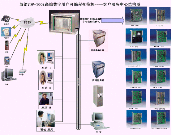 接入平臺實現(xiàn)外界接入的控制和話務(wù)交換、資源的合理分配,是構(gòu)建呼叫中心的成功關(guān)鍵所在。DM大型呼叫中心系統(tǒng)接入平臺采用鼎銘VDP-100i高端數(shù)字可編程交換機,該交換機所有資源板卡都采用了高集成度、功能模塊設(shè)計思想。該接入平臺的結(jié)構(gòu)如上圖所示的右邊(詳細的功能模塊資源板請參閱《鼎銘高端數(shù)字可編程交換機產(chǎn)品手冊》),用戶可以根據(jù)實際情況靈活配置和增減系統(tǒng)的接入方式、資源類型、資源數(shù)量,達到資源的充分合理利用的目的。