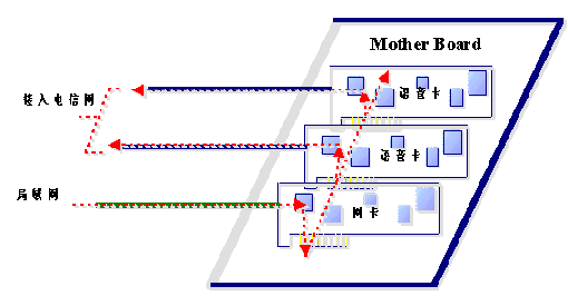 通過(guò)局域網(wǎng)傳遞語(yǔ)音數(shù)據(jù)本來(lái)就不能保證其時(shí)實(shí)時(shí)性,其結(jié)果就是用戶聽到的語(yǔ)音經(jīng)常斷續(xù),保證不了語(yǔ)音質(zhì)量。如果傳遞的語(yǔ)音數(shù)據(jù)是經(jīng)過(guò)壓縮的,語(yǔ)音數(shù)據(jù)本來(lái)就是通過(guò)TTS進(jìn)行合成的,再經(jīng)過(guò)壓縮,則音質(zhì)會(huì)有很大的損傷,因此同樣保證不了語(yǔ)音質(zhì)量。從上圖中我們可以看到,經(jīng)TTS合成的語(yǔ)音數(shù)據(jù)從局域網(wǎng)經(jīng)過(guò)網(wǎng)卡,再通過(guò)主板PCI(或ISA)總線進(jìn)入語(yǔ)音卡,最后進(jìn)入電信網(wǎng),同樣語(yǔ)音數(shù)據(jù)通過(guò)計(jì)算機(jī)主板經(jīng)PCI(或ISA)總線進(jìn)入語(yǔ)音卡也要求是實(shí)時(shí)的。這兩種實(shí)時(shí)性的要求會(huì)導(dǎo)致在接入量比較大的情況下,會(huì)給計(jì)算機(jī)的總線造成很大的負(fù)擔(dān)。因?yàn)榭偩的帶寬(數(shù)據(jù)吞吐量)是有限的。況且其它的板卡和接口(如聲卡、顯示卡等)也要直接或間接地占用總線。因此在接入量比較大的情況下,計(jì)算機(jī)的總線帶寬會(huì)成為一個(gè)比較關(guān)鍵的瓶頸。即便提高語(yǔ)音板卡的接入能力。在有大量電話接入的情況下,由于語(yǔ)音數(shù)據(jù)實(shí)時(shí)性的要求,也不能保證語(yǔ)音質(zhì)量。