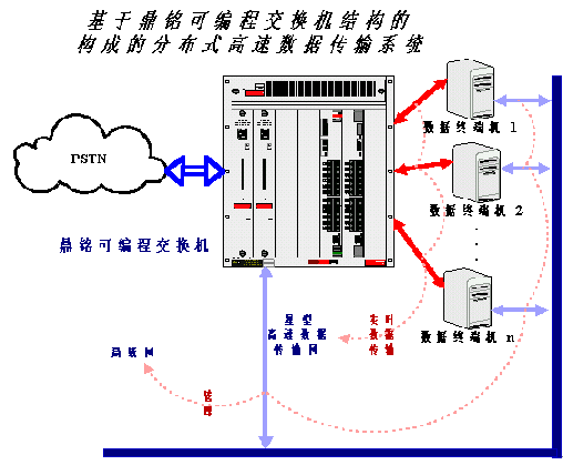 鼎銘高速數(shù)據(jù)傳輸板置于其可編程交換機(jī)內(nèi),外部可以和多臺(tái)PC或工控機(jī)相連,因?yàn)榭删幊探粨Q機(jī)可以級(jí)聯(lián),所以可以和外部連接的PC或工控機(jī)理論上沒(méi)有特別限制。這樣可編程交換機(jī)的內(nèi)部I/O總線(類比于PC機(jī)的PCI或ISA總線)就不再傳輸實(shí)時(shí)數(shù)據(jù)(如語(yǔ)音數(shù)據(jù)),而只負(fù)責(zé)非實(shí)時(shí)性的管理和信令數(shù)據(jù),語(yǔ)音或其它實(shí)時(shí)數(shù)據(jù)從外部PC直接傳入可編程交換機(jī)的高速數(shù)據(jù)傳輸板,然后通過(guò)交換直接進(jìn)入外部公共電信網(wǎng)(PSTN)。