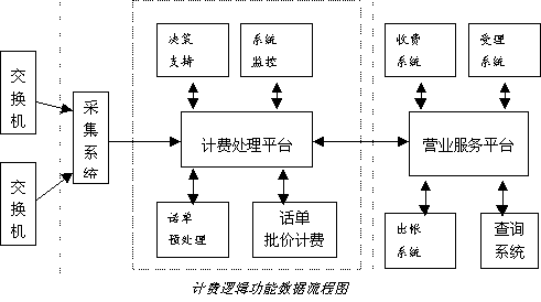 從邏輯功能上分,它經(jīng)常被分為三部分:采集系統(tǒng)、計(jì)費(fèi)處理系統(tǒng)、營業(yè)服務(wù)系統(tǒng)。其具體數(shù)據(jù)流程如下圖所示: