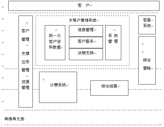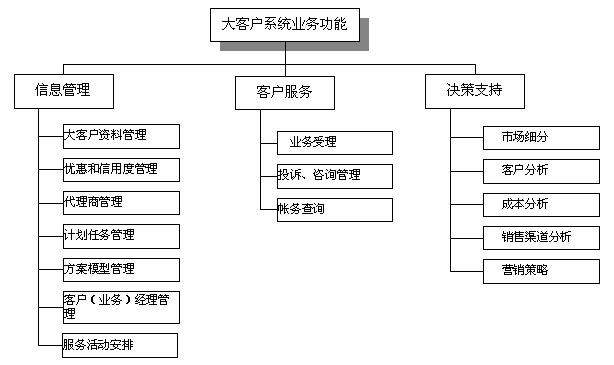 電信大客戶管理系統(tǒng)是在收集大客戶市場調(diào)查信息、大客戶資料信息、大客戶經(jīng)營戰(zhàn)略資源的基礎(chǔ)上,自動(dòng)采集專業(yè)計(jì)費(fèi)、綜合營帳、客服、網(wǎng)管、財(cái)務(wù)等系統(tǒng)的相關(guān)數(shù)據(jù),實(shí)現(xiàn)快速、全面、準(zhǔn)確的新客戶業(yè)務(wù)受理、新增需求受理及故障處理過程通道,實(shí)現(xiàn)完善的客戶經(jīng)理管理、代理商管理系統(tǒng),最終實(shí)現(xiàn)完整的大客戶滿意度評(píng)估體系和針對(duì)大客戶的個(gè)性化服務(wù)。建成后的系統(tǒng)從管理、服務(wù)、分析三方面出發(fā)主要應(yīng)具備信息管理、客戶服務(wù)、決策支持功能。