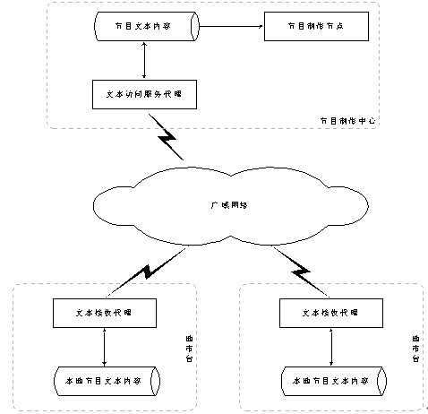 單一的節(jié)目制作中心一般放置在省中心。在節(jié)目制作中心,節(jié)目數(shù)據(jù)以數(shù)據(jù)庫或者文本文件的方式存放于節(jié)目數(shù)據(jù)倉庫中。在節(jié)目制作中心運行文本訪問服務(wù)代理,接受各地市臺的數(shù)據(jù)請求并發(fā)送相應(yīng)的數(shù)據(jù)。各個地市臺通過文本請求、接收代理向中心請求或者接收文本數(shù)據(jù),存放于本地數(shù)據(jù)倉庫,等待語音合成服務(wù)器合成成語音文件,地市臺使用合成后的語音文件迅速開通相應(yīng)的節(jié)目。