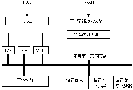 離線合成可以與省級甚至全國聲訊網(wǎng)絡(luò)結(jié)合,開發(fā)出靈活的聯(lián)網(wǎng)業(yè)務(wù)。即文本訪問代理從廣域網(wǎng)上取得節(jié)目文本數(shù)據(jù)存放于本地的文本數(shù)據(jù)共享目錄,語音合成服務(wù)器通過訪問該目錄獲取節(jié)目文本合成為語音文件存放與服務(wù)器的語音文件共享目錄中。局域網(wǎng)內(nèi)其他設(shè)備(IVR、MSI等等)訪問語音文件共享目錄,向用戶播放最新生成的語音信息。