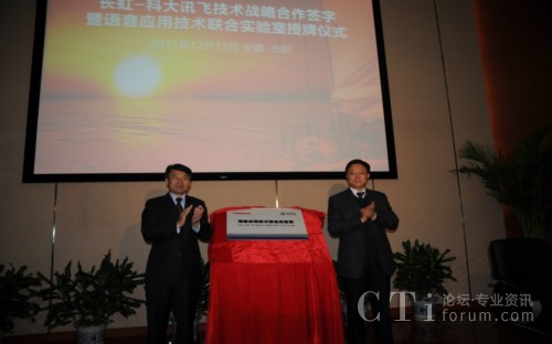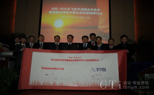 CTI論壇(ctiforum)12月14消息(記者 潘婷婷): 12月12日,科大訊飛與長虹集團戰(zhàn)略合作簽約暨共建聯(lián)合實驗室揭牌儀式在科大訊飛語音產(chǎn)業(yè)基地研發(fā)大樓隆重舉行。根據(jù)合作框架協(xié)議,雙方將在戰(zhàn)略聯(lián)盟的基礎上,以共建聯(lián)合實驗室為主要載體,旨在依托各自行業(yè)領域的長期積淀優(yōu)勢、強強聯(lián)合,達成戰(zhàn)略互信,加強緊密合作,積極推動“語音核心引擎+智能終端平臺” 的特色應用模式,深入拓展智能語音科技在智能電視等終端產(chǎn)品市場的應用范圍,合力開創(chuàng)智能語音終端創(chuàng)新應用市場空間。CTI論壇報道