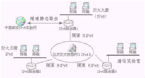 FH6501(IPv6路由器)已經(jīng)在北方交通大學學生IPv6實驗床實際安全運行了六個月。北方交通大學學生IPv6實驗床采用我公司IPv6路由器產(chǎn)品,架構(gòu)了三個主節(jié)點,借助隧道連接到由Nokia資助建設的中國高校IPv6實驗床。目前三個主節(jié)點之間的連接是借助于學校原有的IPv4網(wǎng)絡,通過隧道技術實現(xiàn)節(jié)點間的通信(見圖示)。