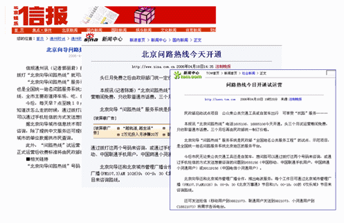 北京向?qū)峋經(jīng)過一個多月緊張的開通工作,終于于4月18號正式開通。新浪、網(wǎng)易、TOM等媒體爭相報道北京向?qū)У拈_通情況。 今后市民問路,可以通過撥打電話1605106、16885106這兩個號碼來咨詢,或通過手機短信的方式發(fā)送想要咨詢的問題到9555156中國移動、中國聯(lián)通手機用戶,中國網(wǎng)通小靈通用戶或99119156中國電信小靈通用戶。