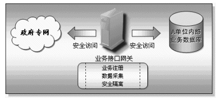 為了實現(xiàn)企業(yè)基礎(chǔ)信息交換與共享,各個接入平臺的單位必須將需要提供給其他單位的企業(yè)數(shù)據(jù)共享出來,基于安全、保密等多種因素考慮,這些單位的業(yè)務數(shù)據(jù)庫不可以也不應該對其他單位完全開放(也就是直接連在政府專網(wǎng)上),而業(yè)務接口網(wǎng)關(guān)的作用就是將業(yè)務數(shù)據(jù)庫與政府專網(wǎng)之間的隔離、實現(xiàn)業(yè)務注冊以及數(shù)據(jù)采集等功能。業(yè)務接口網(wǎng)關(guān)的兩個網(wǎng)絡(luò)端口分別連接業(yè)務數(shù)據(jù)庫以及政府專網(wǎng),機關(guān)單位將它們業(yè)務數(shù)據(jù)庫中需要共享的業(yè)務數(shù)據(jù)項名稱注冊到信息中心的業(yè)務注冊庫中,其他機關(guān)單位通過查詢業(yè)務注冊庫獲取對方單位的業(yè)務注冊信息,并通過自己的業(yè)務接口網(wǎng)關(guān)向信息交換機發(fā)出業(yè)務數(shù)據(jù)采集的要求,信息交換機接收請求后對請求進行校驗,校驗通過后信息交換機會通過被采集業(yè)務數(shù)據(jù)庫所在單位的業(yè)務接口網(wǎng)關(guān)獲取業(yè)務數(shù)據(jù),數(shù)據(jù)通過信息交換機交換到采集單位的業(yè)務接口網(wǎng)關(guān),此時采集單位可以將數(shù)據(jù)保存在己方的采集數(shù)據(jù)庫中,或者直接由應用系統(tǒng)使用。