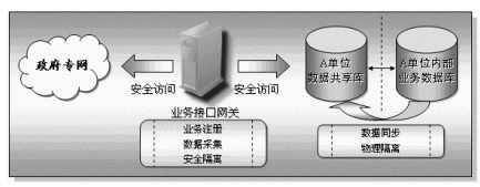 業(yè)務接入網(wǎng)關(guān)放置在每一個接入到本系統(tǒng)的部門或單位內(nèi),具有快速方便的異構(gòu)數(shù)據(jù)庫的連接能力,它主要完成兩個方面的功能,一方面實現(xiàn)本部門共享信息的對外發(fā)布,另一方面也通過核心的信息交換機實現(xiàn)其它相關(guān)部門的共享信息的采集工作。業(yè)務接口網(wǎng)關(guān)具有兩個網(wǎng)絡(luò)接口,一端連接本單位的內(nèi)部網(wǎng)絡(luò),另一端接入政府專網(wǎng)中。