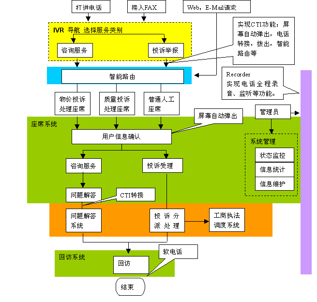 黎明網(wǎng)絡深入研究世界上最新的CTI技術的發(fā)展和應用,自主研發(fā)推出的12315消費者投訴受理系統(tǒng)采用當前主流的一體化的呼叫中心模式。一體化的呼叫中心模式具有投資少、易于實施、維護工作量較小、維護成本低的優(yōu)點。該系統(tǒng)建立在內(nèi)部以太網(wǎng)基礎上,不同網(wǎng)絡(PSTN網(wǎng)、IP網(wǎng)、GSM/GPRS/CDMA網(wǎng))的消費者可以通過多種方式(電話、傳真、E-mail、短消息等)接入12315系統(tǒng),利用系統(tǒng)提供的服務進行投訴舉報或咨詢。