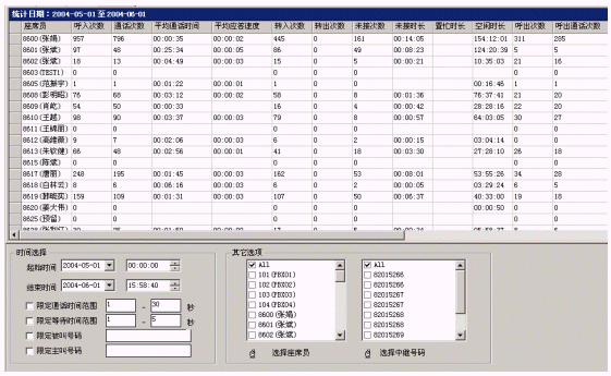 呼叫統(tǒng)計(jì)是呼叫中心最重要的功能。該呼叫中心系統(tǒng)設(shè)計(jì)了一整套豐富的呼叫統(tǒng)計(jì)管理工具,能有效地實(shí)現(xiàn)對業(yè)務(wù)、設(shè)備、人員的全面管理,使呼叫中心隨著運(yùn)營的過程效益不斷地提高。同時(shí)提供實(shí)時(shí)的監(jiān)控工具,使管理人員及時(shí)了解整個系統(tǒng)的運(yùn)行狀態(tài)。