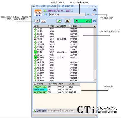 辦公人員可以通過時實電話的界面:實時監(jiān)控系統(tǒng)的呼叫隊列、其它辦公人員的工作狀態(tài);并且通過屏幕控制電話的接答、掛機、轉(zhuǎn)接,以及建立會議等操作。如下圖所示: