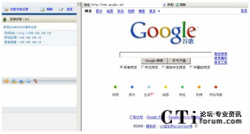 在客服人員與網(wǎng)站訪客聊天的過程中,可以通過“網(wǎng)頁同步”,使網(wǎng)站訪客的電腦上自動彈出與客服人員同樣的網(wǎng)頁(如下圖:網(wǎng)站訪客的電腦上自動彈出www.google.com的網(wǎng)站)。