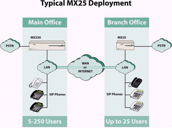 當與MX250一起使用時, MX25提供了一種既能將MX250的功能擴展至分支機構,同時又可確保該分支機構與PSTN有效連接的低成本的解決方案。遠程機構的工作人員同樣可以使用語音信箱、自動話務員、在線狀態(tài)和即時消息等功能。如同在總部工作一樣這些遠程機構的工作人員可以與企業(yè)內(nèi)部任意其它地點的人員進行溝通,也可以擔當接線員或ACD(自動話務分配)組成員的工作。
