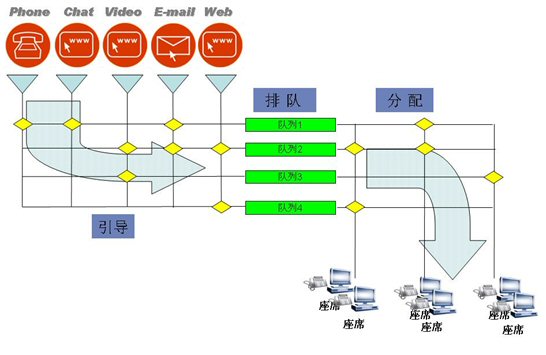 對于多種媒體采用統(tǒng)一的ACD處理方式,經(jīng)過引導(dǎo),進(jìn)入不同的隊(duì)列,分配到不同的坐席組。