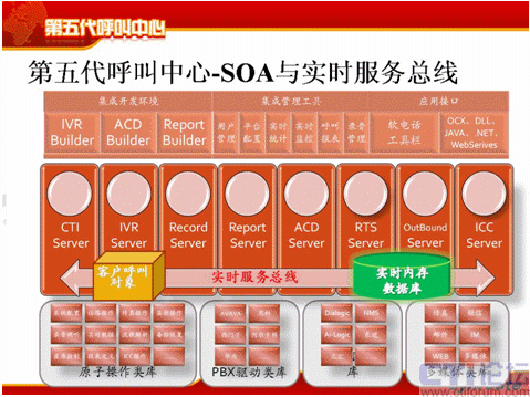 IBM、微軟、BEA、朗訊、AVAYA、甲骨文等等都開始去支持SOA,SOA被公認為解決當前解決軟件聚合的有效方式,其中一個重要的概念就是ESB,再強調一下ESB是企業(yè)服務總線。僅有SOA是不夠的,因為ESB它的典型特征是面向WEB非實時的系統(tǒng),這個非實時的系統(tǒng),呼叫中心的實時要求太高了,一個電話來了以后,做屏幕彈出的時候,你需要一秒鐘之內屏幕彈出來;如果非實時的,就要五秒、十秒,這個是接受不了,接著說現(xiàn)場管理和座席的自我管理也是不允許的,現(xiàn)在要實時看到座席的占有率,看到排隊情況,看呼損這些指標,可是光單純地用ESB是解決不了,所以我們就提出了實時服務總線。