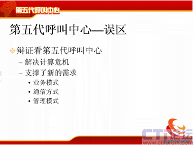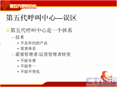 下面我提第五代呼叫中心的誤區(qū),首先我們要辯證地看第五代呼叫中心,剛才好像我在解決問題,這個呼叫中心的計算危機產生了,我在解決計算危機的問題,但是大家要反著想,我把這個問題解決了,我按這種方式去架構了,這時候它的業(yè)務模式就能支持到非常豐富了,而以前的業(yè)務模式,業(yè)務的創(chuàng)造為什么進行不下去?我們不能說全部都是因為IT系統(tǒng),但是IT系統(tǒng)占很大的一個部分,其實就是因為投資的部分,如果你有足夠錢的話,可以實現(xiàn)足夠的想法。第二個方面通信方式也是一樣,通信方式也是你可以支持更多的通信方式,你可以將3G的視頻加上去,你可以將很多業(yè)務加進去,你可以把固定點報警加上去,你可以把IPTV的業(yè)務方式加上去,管理模式也一樣,你可以不斷地調整,這個調整只要是在框架一定范圍內不斷地調整都可以支持,那么對于運營管理也能同樣進行有效的支持。
