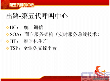 迎接第五代呼叫中心的挑戰(zhàn),重申一下,第五代呼叫中心的四個特性:UC統(tǒng)一通信的;SOA面向服務架構和實時服務總線技術;JIT的準時化生產;TSP全業(yè)務平臺。