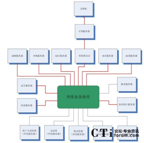 很多集成商或業(yè)務(wù)軟件開(kāi)發(fā)商認(rèn)為這種結(jié)構(gòu)過(guò)于復(fù)雜,而他們自身往往提供“整體解決方案”,即所有的服務(wù)器軟件基本上都是自己的,根據(jù)客戶(hù)的要求修改即可。例如,客戶(hù)關(guān)系管理、知識(shí)庫(kù)、投訴管理、OA、訂單管理以及坐席軟電話、ADS服務(wù)器、IVR服務(wù)器、ACC服務(wù)器、ICC服務(wù)器、ACD服務(wù)器、錄音服務(wù)器、傳真服務(wù)器、報(bào)表服務(wù)器、實(shí)時(shí)統(tǒng)計(jì)服務(wù)器都是自己來(lái)做,那么對(duì)于很多接口環(huán)節(jié)都可以節(jié)省了。