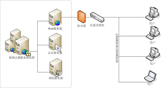 客戶可以通過訪問放置在甘肅省移動公司面機房內的Web服務器,同時WEB服務器發(fā)送請求到認證服務器,通過客戶AAA級認證后的,客戶經過調度服務器將請求反饋給視頻服務器,完成視頻點播流程,具體架構如圖。