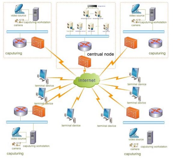 所有的部門的直播系統(tǒng)主要是進行部隊演習、會議等現(xiàn)場的直播,直播信號通過WebLIVE視頻直播采集系統(tǒng)編碼壓縮,通過局域網(wǎng)上傳到中心機房,實時發(fā)布。采集同時,將直播的數(shù)字信號存儲為AVI文件,上傳到放置在視頻點播服務器內(nèi),供其它地區(qū)的部隊指戰(zhàn)員進行點播。